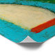Contemporary abstract painting featuring bold shapes in random array with lines, dots, circles and scratches. The piece is black, white, dark orange, green and blue with colourful unexpected pops scraped from below the surface.