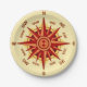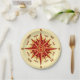 A simple graphical image of a vintage compass rose showing all 16 points of the compass in shades of red with brown lettering on a gold and cream coloured background.