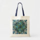 An abstract mandala hand drawn with pen and ink in a striking starburst and flower pattern. Coloured with pencil in hues of blue and green.