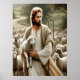 Surrounding Him are sheep of varying shades of light brown and tan wool, scattered across a peaceful pastoral landscape. The lush green hills and foliage provide a vibrant backdrop, while a soft blue sky with scattered clouds adds to the serene ambiance. The diffused lighting gently illuminates the scene, highlighting the tranquillity and balance of the composition.