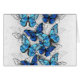 Vertical composition of realistic, blue and white morpho butterflies on grey textured background. Morpho blue butterfly.