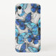 Vertical composition of realistic, blue and white morpho butterflies on grey textured background. Morpho blue butterfly.