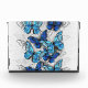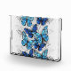 Vertical composition of realistic, blue and white morpho butterflies on grey textured background. Morpho blue butterfly.