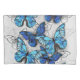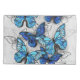 Vertical composition of realistic, blue and white morpho butterflies on grey textured background. Morpho blue butterfly.