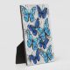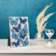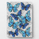 Vertical composition of realistic, blue and white morpho butterflies on grey textured background. Morpho blue butterfly.