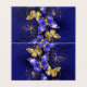 Composition of luxurious sapphire and gold jewellery butterflies on blue textured background.