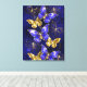 Composition of luxurious sapphire and gold jewellery butterflies on blue textured background.