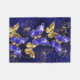 Composition of luxurious sapphire and gold jewellery butterflies on blue textured background.