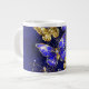Composition of luxurious sapphire and gold jewellery butterflies on blue textured background.
