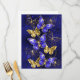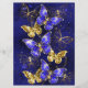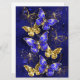 Composition of luxurious sapphire and gold jewellery butterflies on blue textured background.