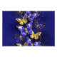 Composition of luxurious sapphire and gold jewellery butterflies on blue textured background.