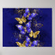 Composition of luxurious sapphire and gold jewellery butterflies on blue textured background.