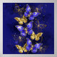 Composition of luxurious sapphire and gold jewellery butterflies on blue textured background.