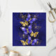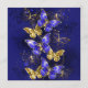 Composition of luxurious sapphire and gold jewellery butterflies on blue textured background.