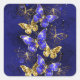 Composition of luxurious sapphire and gold jewellery butterflies on blue textured background.