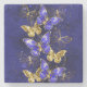 Composition of luxurious sapphire and gold jewellery butterflies on blue textured background.