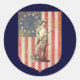 Vintage looking drawing of Concord Minuteman with 13 colonies (Betsy Ross) first American flag in the background on shield shape. Distressed. You can add your message