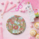 Cute cone flower fairy house paper plates, perfect for a fairy birthday party. Small fairy house nestled into a cone flower garden printed on small paper plates.