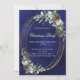 A navy blue, uneven coloured background decorated with cones, white berries and greenry. A faux gold oval frame. Personalise and add the details.