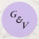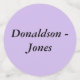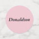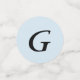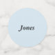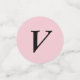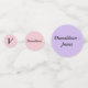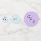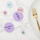Wedding confetti with individual initials for bride and groom on either side of small dots. Medium dots show last names. Large dots show initials on one side and married name/s on reverse. Coloured backgrounds are blue for groom, pink for bride, and purple for couple.