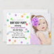 A cute design with pastel confetti dots and your birthday honoree's photo. Simply insert your photo in place of the sample photo shown and edit the easy design template with your party details. This invitation works for all ages and events simply by changing the wording to suit your special event. It also makes a nice keepsake after the party. The reverse side of the invitation is shown here in a lavender colour. You can change this colour to any other colour by selecting the "customise it" option and choosing a different colour from the background choices.