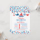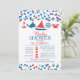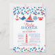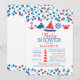Modern confetti nautical baby shower for a baby boy. Our contemporary and fun boys baby shower invite features bold & bright red & blue confetti set on a white background with a red & blue sailboat, whale, ship wheel, anchor & crab and a lighthouse.