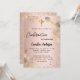 A blush, rose gold background decorated with golden eucalyptus and faux gold sparkles. Personalise and a name and ceremony details. Black coloured letters.