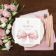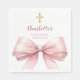 A white background color. Decorated with a large pink bow and a golden cross. Personalize and add the name and date.