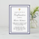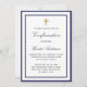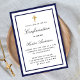 A modern, elegant and confirmation invitation. A white background decorated with royal blue frames and a golden cross. Personalise and add a name and details. Black coloured letters.