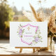 A white background. Decorated with a pink crest, pink and purple flowers, florals. With a golden cross.