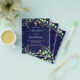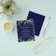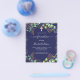 A navy blue background decorated with eucalyptus greenery and golden leaves and faux gold glitter sparkles. A golden cross. Personalise and the child's name and ceremony details.
