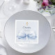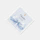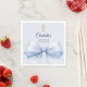 A light blue background color. Decorated with a large light blue colored bow and a golden cross. Personalize and add the name and date.