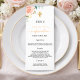 Confirmation reception menu card. Personalise and add a name, date and the menu. A chic white background. Decorated with a watercolored rose gold and blush pink rose and green eucalyptus leaves, sprigs, greenery, faux gold leaves. A faux gold cross.