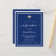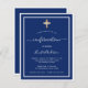 A modern, elegant and invitation. A navy blue background decorated with white frames and a golden cross. Personalise and add a name and details. White text.