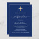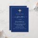 A modern, elegant and invitation. A navy blue background decorated with a golden cross. Personalise and add a name and details. White text.
