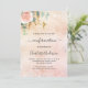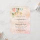 A rose gold and blush pink gradient background decorated with eucalyptus greenery, a rose gold and blush pink rose, and golden leaves and faux silver sparkles. Personalise and the girls name and ceremony details.