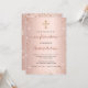 A rose gold faux metallic looking background. Decorated with rose gold, pink faux glitter dust. Personalise and add a name and details. The name is written with a hand lettered style script