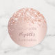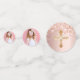 A rose gold background decorated with faux rose gold glitter dust. Personalise and add a date and name/event. Dark rose gold coloured letters. Some confetti chips with name and date, others with a cross. Add your own photo on two of the chips.