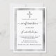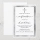 A modern, elegant and invitation. A white background decorated with a faux silver cross, and faux silver frames. Personalise and add a name and details. Black text.