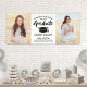 Add a personalised touch to college or high school graduation party decorations with this black and white custom photo banner. Design features a plain white background with black mortar board, stylish modern typography, hand written style script calligraphy, and 2 photos of the graduate, such as senior pictures or images from the commencement ceremony. All text is simple to customise. This party sign is an elegant way to celebrate the special day. Congratulations to the graduate!