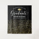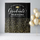 Send off your grad in luxe style with this black and gold confetti graduation backdrop! The design features "Congrats to Our Graduate" in flowing white script, a gold grad cap, and personalized fields for the graduate's name and school above a cascade of shimmering gold confetti dots on a sleek black background. Customize all text for a glamorous celebration centerpiece. Perfect as a photo wall, dessert table, or party focal point.