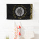 A graduation banner which says Congrats Graduates, Class of 20xx written in a gold colour and curved around an illustration of a black graduation cap inside by a semi-transparent white circle. Faux gold confetti glitter across th top. The confetti is not real it is just a digital image. Black background with gold lettering is simple yet stylish.