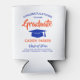 Add a personalised touch to college or high school graduation party decorations with orange and blue can coolers. Design features a white background, blue mortar board cap, stylish modern typography, handwritten style script calligraphy, and a customisable message reading "Congratulations to our Graduate". Text at the bottom includes class year, school name, and an optional line for degree, honours, or other info. All text is simple to customise. These elegant favours make a stylish graduation celebration drink idea. Cheers!