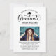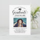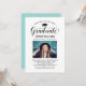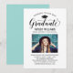 Elegant graduation announcement card and graduation party invitation congratulates and announces your grad in style! Features black grad cap, "Graduate" in script, and modern custom text that can be personalised with the graduate's name, school, and party details. Add a favourite photo of the grad. Note, the light aqua green blue accent colour on the back of the card can be changed to white or another colour that coordinates with the photo or party colours.