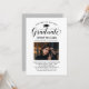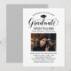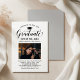 Elegant graduation announcement card and graduation party invitation congratulates and announces your grad in style! Features black grad cap, "Graduate" in script, and modern custom text that can be personalised with the graduate's name, school, and party details. Add a favourite photo of the grad. Note, the neutral grey accent colour on the back of the card can be changed to white or another colour that coordinates with the photo or party colours.