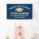 Congratulate your graduate in style with a modern personalised graduation banner sign, featuring their class year with gold coloured grad cap, and sporty custom text for the grad's name, school, and class year. Navy blue, white, and gold colours can be customised to match your party colours.