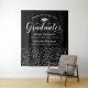 Elegant black graduation party backdrop two graduates features a faux silver foil grad cap, "Graduates" in white script, and modern custom text that can be personalized with the graduates' names and schools. A pattern of silver falling confetti dresses up the background - perfect party prop for guests to stand in front of for pictures with the grad! Multiple Sizes are available.