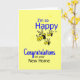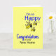 Congratulation on a new home with the text I'm so happy for you in blue and black with 3 cartoon bee's on a yellow background.