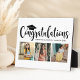 Stylish 3 photo graduation plaque display sign with easel features "Congratulations" in trendy black calligraphy script with grad cap and modern custom text for the graduate's name and class year. Add three favourite photos of the graduate to the square placeholder images. Clean white background colour.