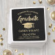 Add an elegant personalised touch to college or high school graduation party decorations with these custom black and gold paper napkins. All text is simple to customise. Design features a black background, faux foil mortar board cap, stylish modern typography, and handwritten style script calligraphy. Please note that gold is printed colour, not metallic foil. Congratulations to the graduate!